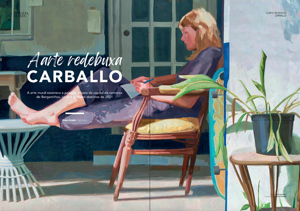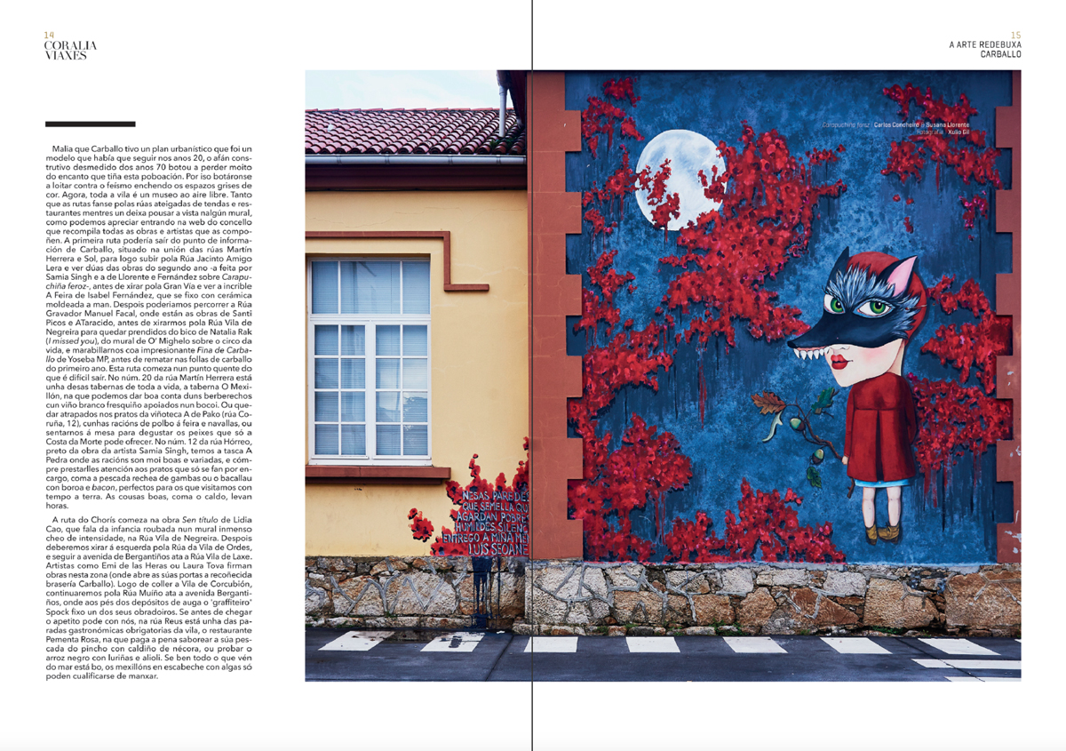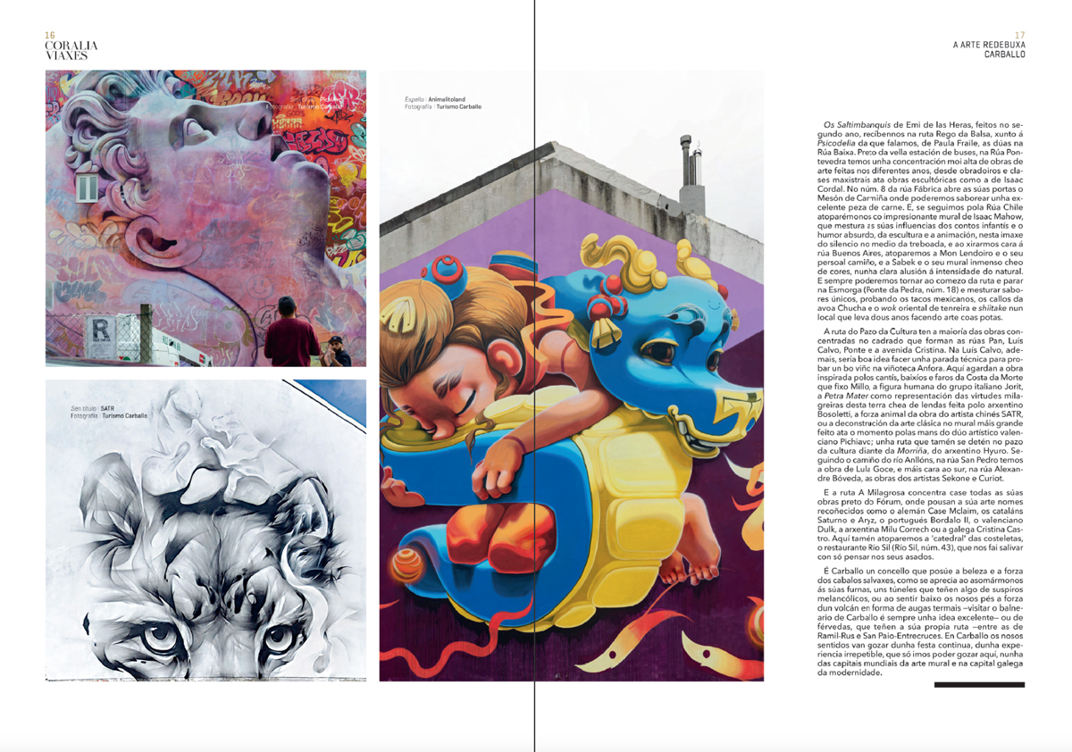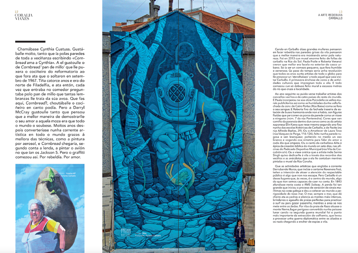 La revista Coralia plasma en un amplio reportaje las claves del proyecto de arte urbano de Carballo, señalando la localidad como uno de los destinos de 2021. En un número que dedica a destacar los mejores planes para recorrer Galicia a lo largo de este año que acaba de comenzar, Carballo ocupa un lugar preeminente como un museo al aire libre que hay que visitar, disfrutar y recorrer con calma. El objetivo: poder disfrutar de los murales, pero también, como explica el reportaje, de todo lo que Carballo puede ofrecer. Porque «en Carballo nuestros sentidos van a gozar de una fiesta continua, de una experiencia irrepetible, que sólo vamos a poder disfrutar en una de las capitales mundiales del arte urbano y en la capital gallega de la modenidad».