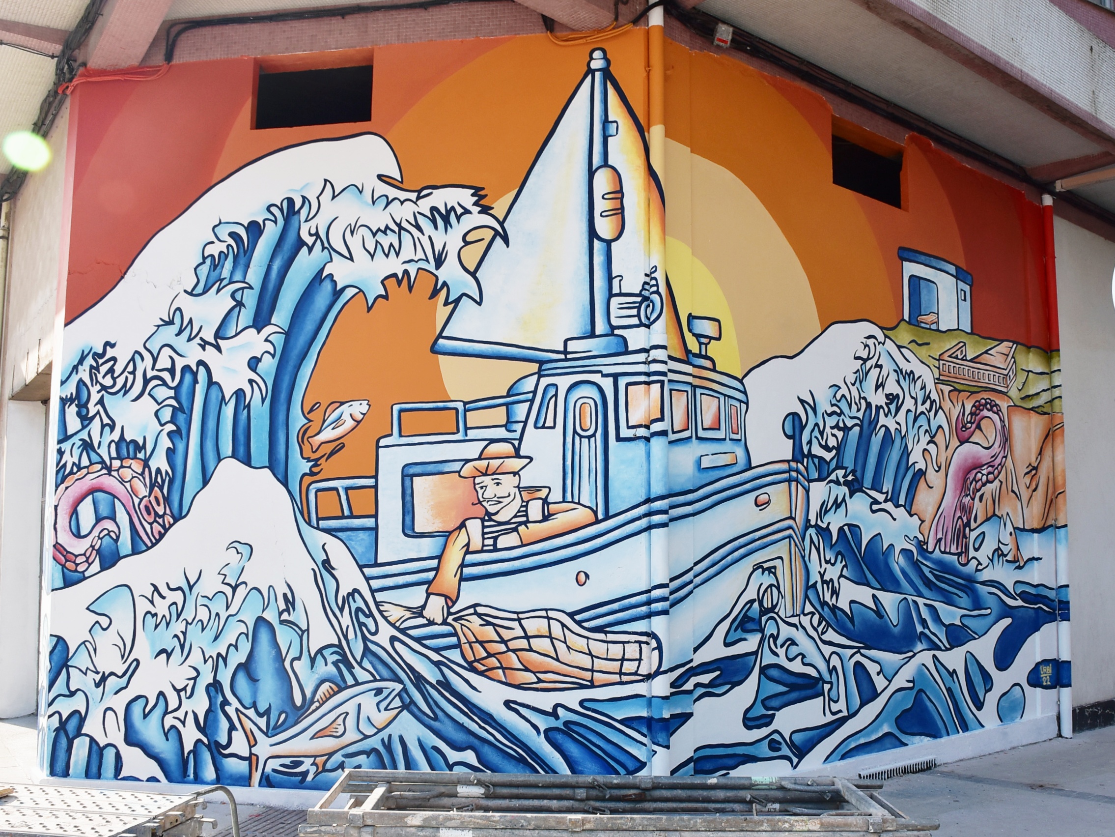 - Mar do Norte – Andrés Urbieta. Calle Pontevedra esquina con Baños Vellos. El mural de este carballés habla del mar de Razo. De los marineros que se meten en medio de las aguas bravas para conseguir alimento. De los animales que habitan el mar, como los pulpos y los peces. Y también incluye un mirador y un puesto de socorrismo, para quiénes disfrutan el mar sin tanto peligro.