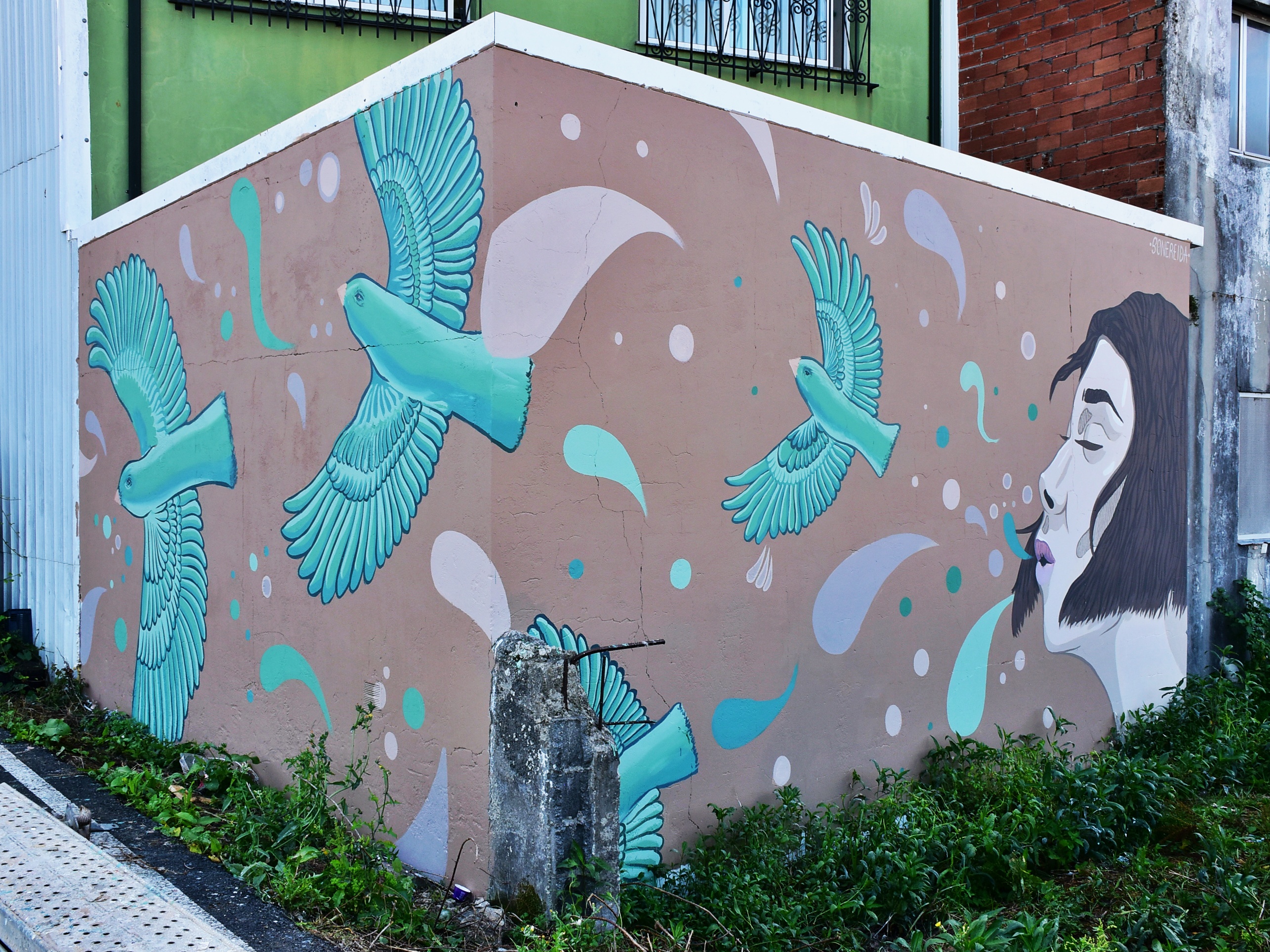 - Liberdade – Nerea Barrientos. Calle Arzobispo Romero de Lema. El título del mural es Libertad y los pájaros le parecen a la artista una buena forma de representarla. Todos tenemos derecho a vivir nuestra vida y nuestro momento, volar con entera libertad, persiguiendo la felicidad con uno mismo.