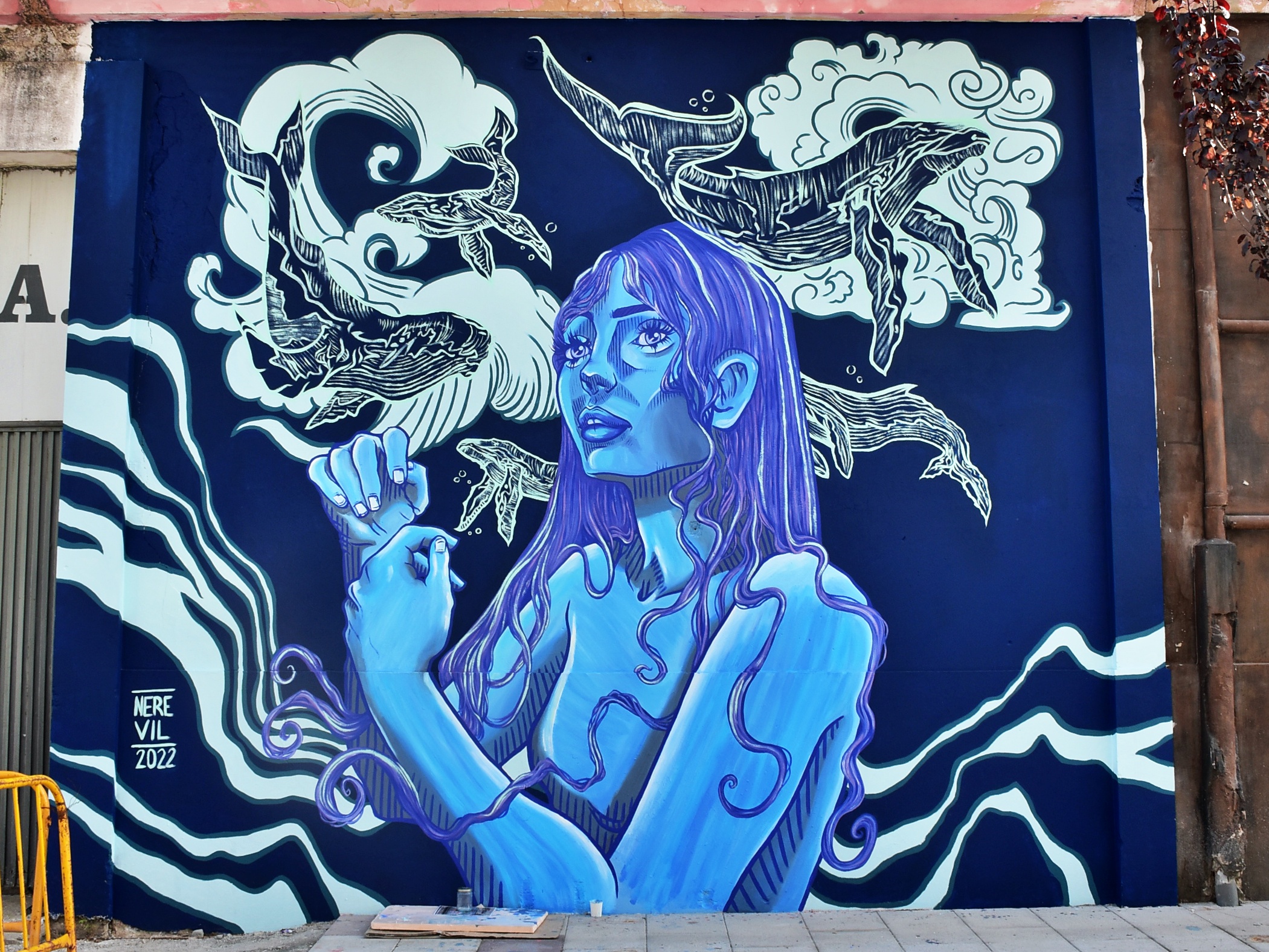 - Oniria – Nerea Vilariño. Calle Pontevedra. La palabra oniria viene del concepto de onirismo, que es un estado en el que la persona pierde consciencia de la realidad y entra en otro donde se enfrenta a alucinaciones. La temática que la artista representa es algo así como los sueños lúcidos, donde la persona es consciente de encontrarse soñando y tiene un mayor control sobre lo que hace o vive en el sueño. Obviamente la escen del mural trata un surrealismo detectable en el que las ballenas vuelan sobre las nubes como si de pájaros se tratase.