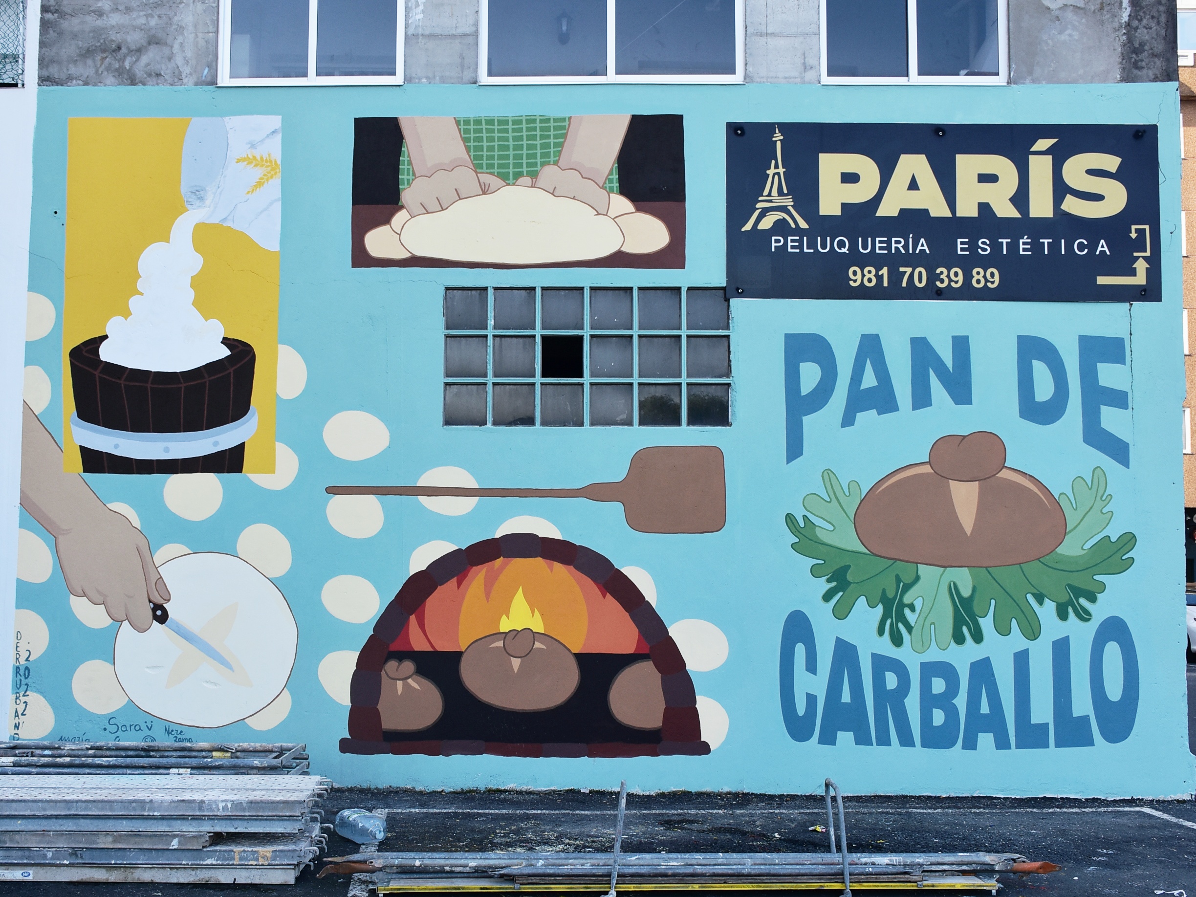 - Pan de Carballo – Obra colectiva. Aparcamiento de la calle Pontevedra. Diseño de Nerea Barrientos e Isa Bermúdiez. Pintado en el Taller de iniciación al muralismo con la colaboracialn de María Barca, Tamara Calvo, Ramón Lema y Sara Vilariño. El mural muestra las diferentes etapas de elaboración del pan de Carballo, que tanta fama tiene. El trigo, la harina, el amasado, la hechura del mollete, el horno y el mollete ya hecho.
