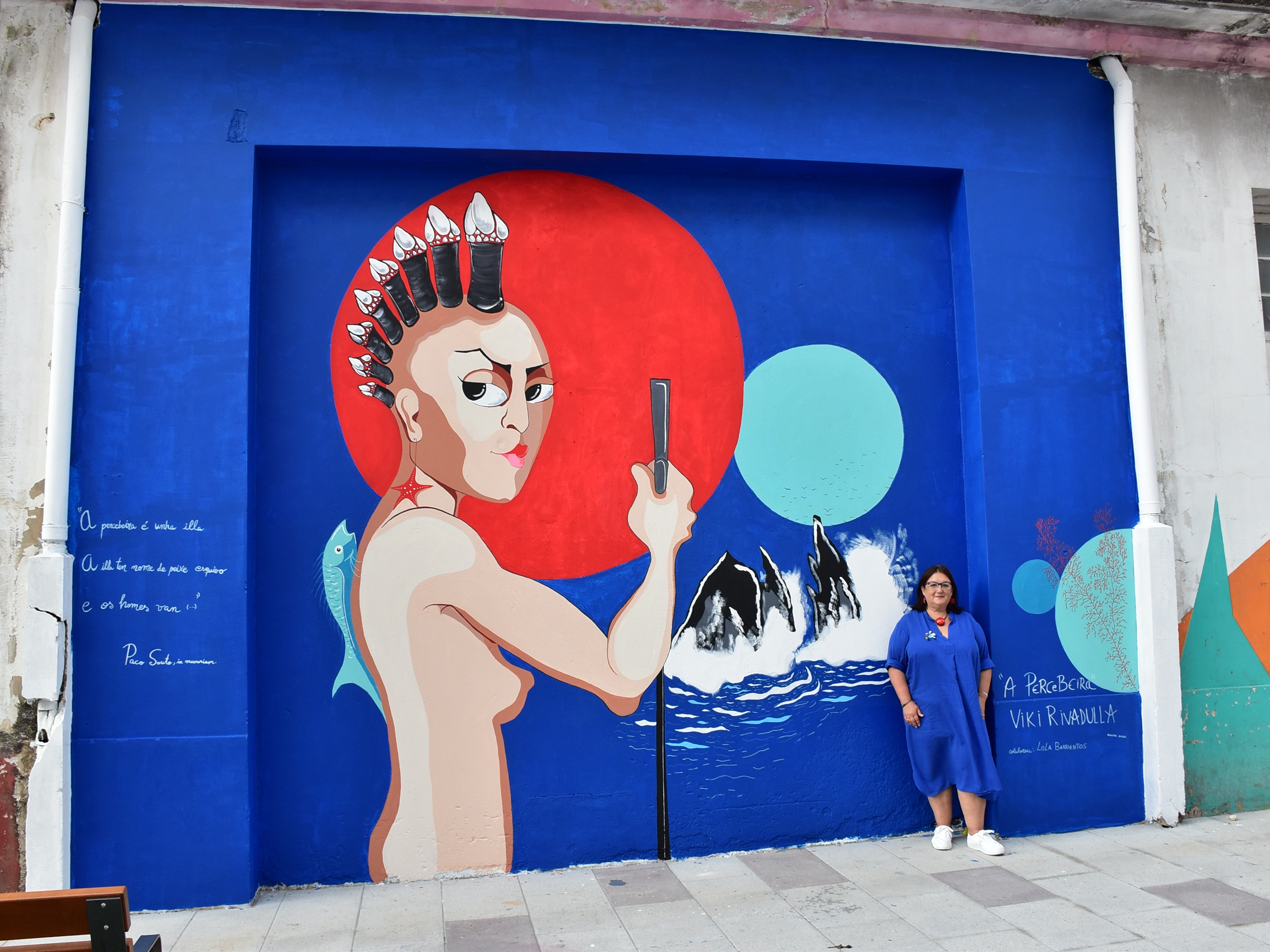 - A Percebeira – Viki Rivadulla. Calle Pontevedra. Ella misma describe su mural: Derribamos los muros para ver el mar. La vista sigue ahora hasta Razo, hasta A Percebeira. En su costa trabajan hombres y mujeres que arriesgan la vida entre salseiros y golpes de mar. Para ellas y ellos es este mural. Y de entre todos ellos, para Paco Souto. El poeta percebeiro de manos generosas y mirada limpia. La iconografíla del mural es una alegoríla de A Percebeira que juega con el doble sentido de la palabra: la piedra y la trabajadora percebeira. Ahora el mar de Razo llega hasta la calle Pontevedra para que entre el ir y venir del pueblo, sintamos el olor del salitre y se escuche la voz de Paco.