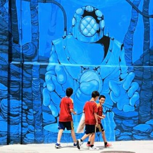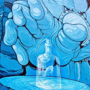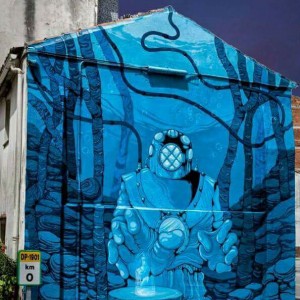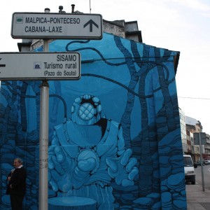 Mou’s mural, a graffiti artist member of the collective urban art project “Desordes Creativos” and former Rexenera Fest coordinato, depicts a diver who finds a bottle with an oak leaf, which is meant to represent the town’s spirit; the painting is on the side of the building on the corner of the road that leads to Malpica and Sisamo. This work, therefore, shows the search for the roots of Carballo. The area was formerly known for its natural medicinal springs, thanks to the ancient trees, which nourished the water with minerals and nutrients. Mou manages to reflect this idea with a modern aesthetic, close to the European comic strip, made almost entirely in a single chromatic range, using only blue colour, which endows the surface with an aura of mystery.