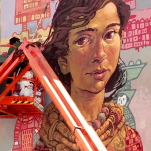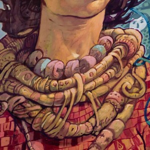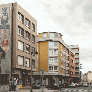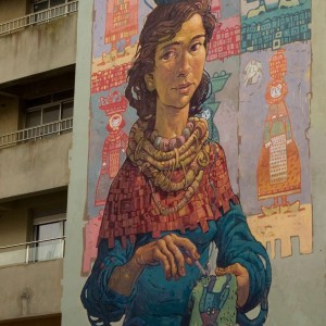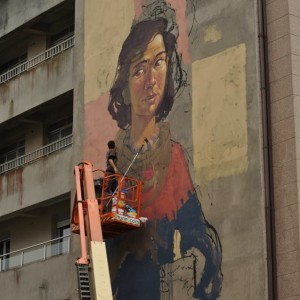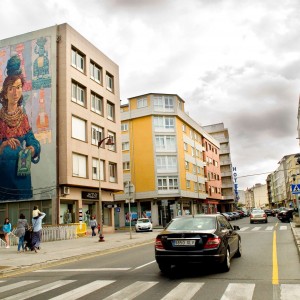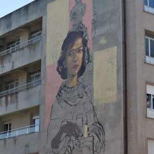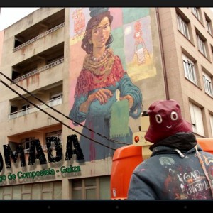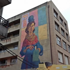 Throughout history, Galician women carried on their shoulders a huge weigth, both physical and metaphorical. Buckets of fish, dairy products, bunches of grass, shopping bags, fair goods, and the great weight of life on their backs.Nömada’s mural is a tribute to matriarchy, specifically to Galician women, and it is inspired by the local legend of the Moorish Stone. The female figure on the mural is the representation of this legend, which explains the origin of the Pedra Moura stone dolmen. The story goes that the moorish woman of the legend carried a stone on her head while she was spinning and when she got tired she put it on the ground, and the stone grew. The protagonist of this mural is also spinning, making a tapestry that represents Galician women that formerly carried the basket on the head, transporting the goods of the commercial activities people had in those days. A total of six women can be seen on the wall, each carrying different products, emphasising the different trades of each time and highlighting women’s vital importance in the development of our past and present society.