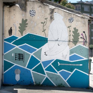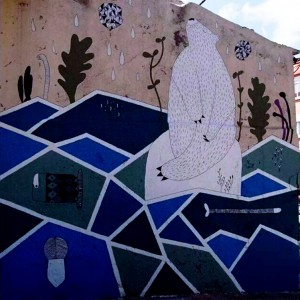 A big bear that seems to come out of the wall in 120, Vázquez de Parga street, is Laura Tova’s mural main feature. Its title, Amanecer (Dawn) , refers to the beginning of life, originally the word meant “to love the beginning” every day. The water has a strong presence in the mural and it is a symbol of life while the white bear is purity. The geometric elements refer to nature within the universe, where geometry is the origin.
