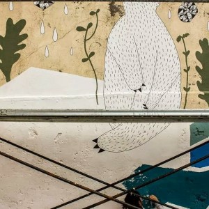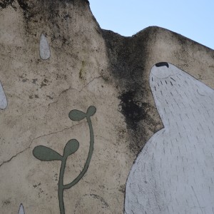 The artist’s work, both illustrative and narrative, stands out for the way it integrates the drawing with the wall´s irregular texture, which maintains its original appearance. So much so that the bear seems to be coming out of the wall to greet the new day.