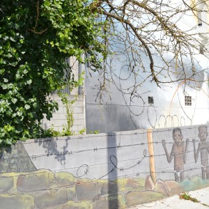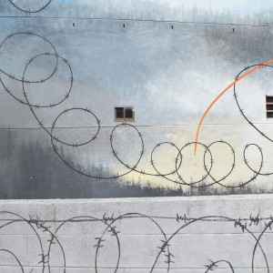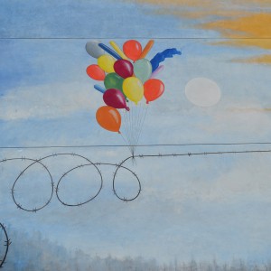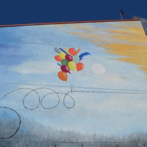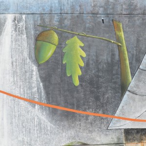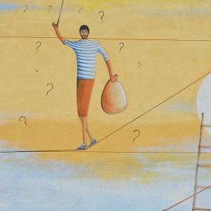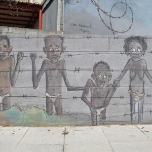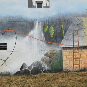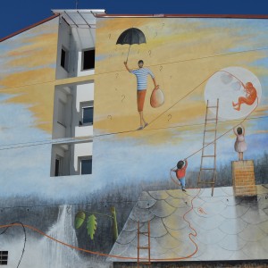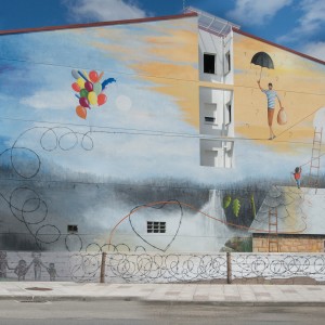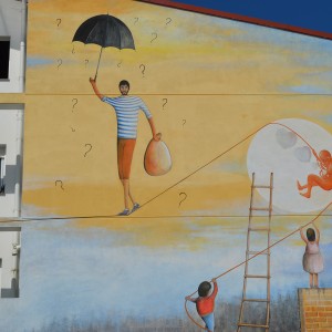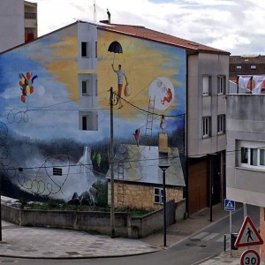 Through his intervention on 38, Vila de Negreira street, the local multidisciplinary artist, Miguel Ángel Calvo, nicknamed O’Mighelo, wanted to reflect his vision of the cycle or “circus” of life. In the author’s own words: “Towards freedom, in search of freedom (almost always…towards freedom); whether we want it or not, the fact is that more often than not, we are unaware and show no regrets and almost without punishment, streams of blood are poured in its name, “freedom”; freely, and without worrying at all about other people’s tears of blood. Thus, the theme of this mural is the struggle in the search for freedom, which sometimes comes at a price and even costs life and a loads of blood. The figure that pretends to be an acrobat hanging from a thread represents the path of human beings in life, accompanied by the notion of uncertainty that sometimes entails the persecution of a new life, with the ignorance of destiny, hence the question marks that can be seen around the “acrobat”. The concept of life is represented by the umbilical cord, which, held by two children, is connected at the other end to a heart-shaped wire of thorns, as a symbol of the life-death connection in this context of uncertainty (balloons).
