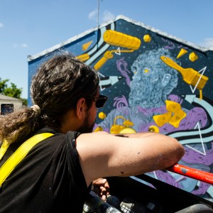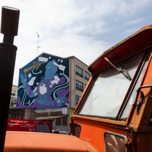 In this mural, Sokram is talking about vital balance and fugacity, priorities and juggling, in a spiral that we cannot stop from spinning. But we can, perhaps, choose which elements to keep and which ones we give all the value and priority they deserve. This idea is reinforced by a weightless horror vacui in which all the elements seem to float in space around the main figure, which acts as a common thread and link between them. We find golden symbols that represent a conceptual juggling game. And they contrast with the cold and deep tones that represent the uncertain creative universe. Everything makes sense thanks to an accurate and omnipresent theme that provides the coherence and concreteness necessary for the entire composition. The mural is located at 71, Milagrosa Avenue.