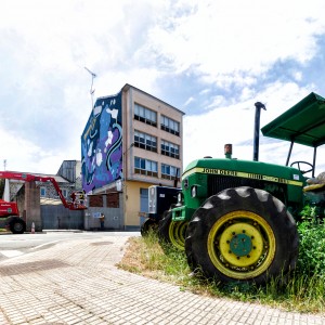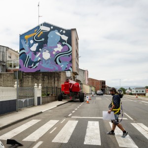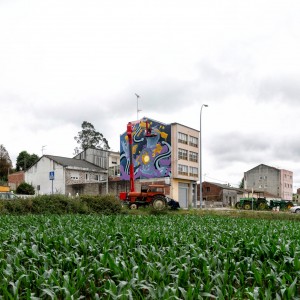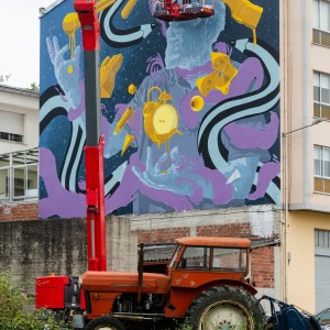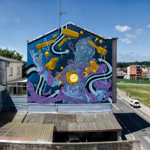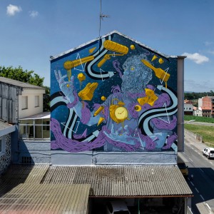 During Rexenera Fest 2020 Sokram created the mural “Entropías e distopías” (“Entropies and dystopias”). In the artist’s words: “There are those people who value the material above all else, prioritizing the accumulation of the greatest possible amount of goods throughout their lives. Something that supposedly brings them a sense of satisfaction and security for the present and the future. There are also others who see time as the only true treasure that we have, the one thing that we can use to develop what truly makes us feel passion, balancing us and making us grow inside … So much so that it makes them forget everything that is unimportant … like shaving for instance. ”