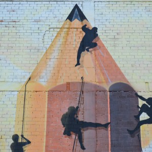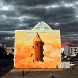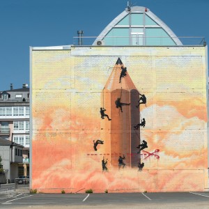 Sokram’s mural, O lapis do graffiteiro, is located on one of the sides of the town´s Pazo da Cultura. This mural was conceived in the painter’s mind as a metaphor around the world of artistic creation. It is a reflection on the urban art movement, which can be applied to other life areas; it aims to reflect on the current trend in this artistic field, whereby some creators try to make ever bigger works at the expense of the content. It is a metaphor for the race to conquer the highest peak.