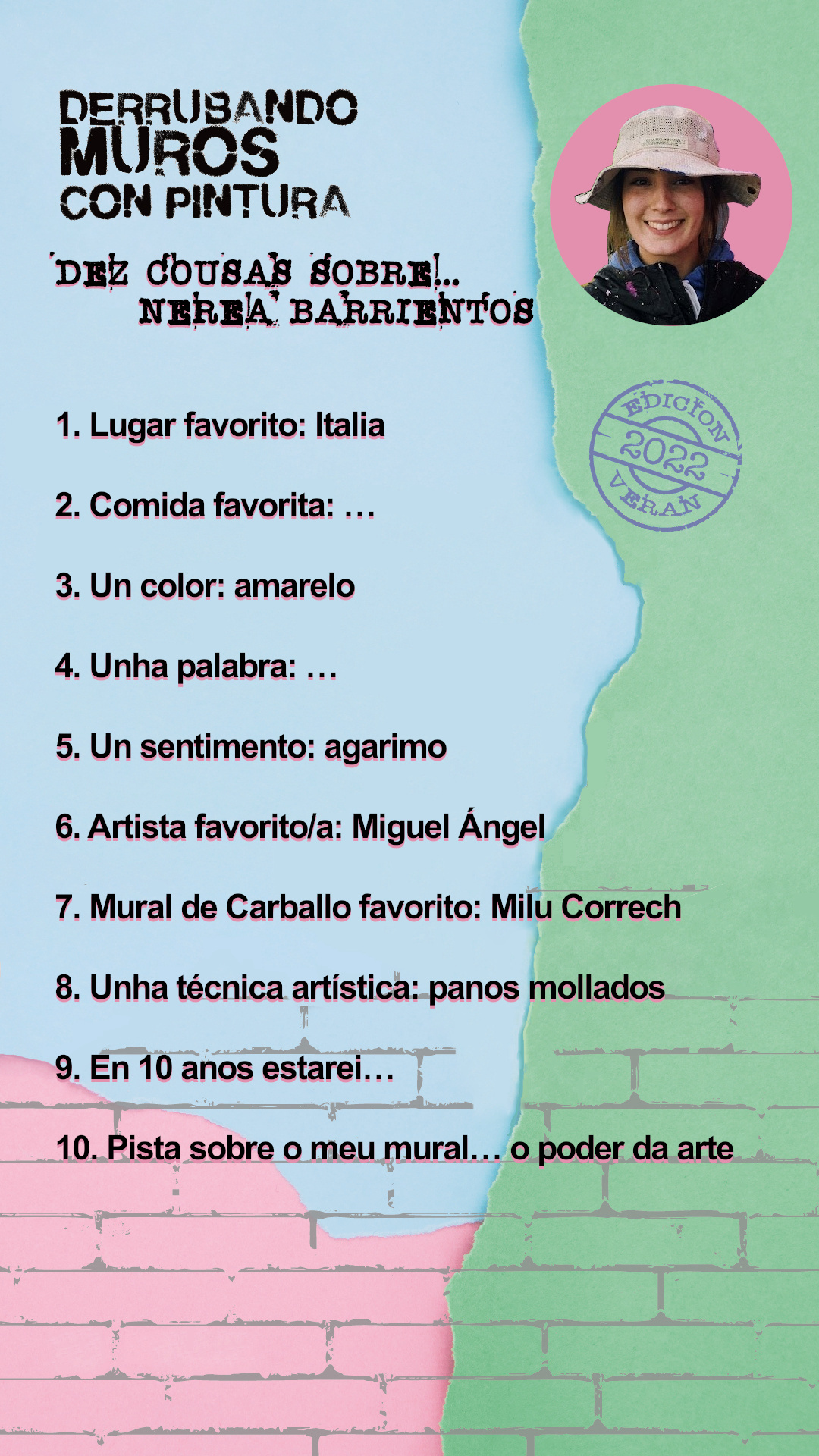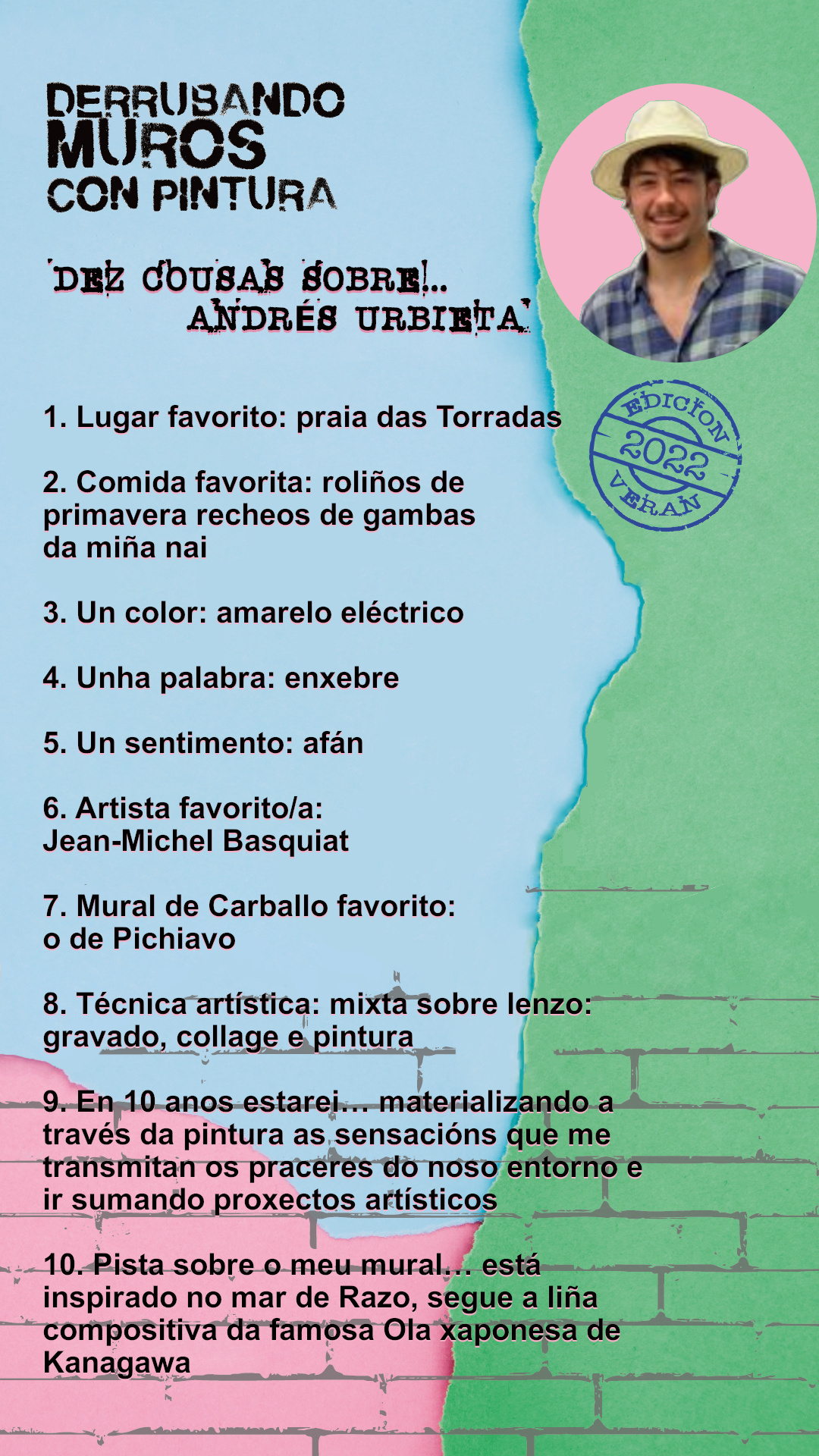 Este mes de agosto volve unha iniciativa que na súa primeira edición tivo moi boa acollida e que seguro que nesta nova andaina seguirá o seu exitoso camiño: Derrubando Muros con Pintura – Edición Verán. Trátase dun espazo no que acoller ás e aos artistas locais de Carballo e a Costa da Morte para que creen novas obras de arte nos muros da localidade. Esta vez serán Andrés Urbieta, Nerea Barrientos, Nerea Vilariño e Viki Rivadulla as encargadas de aumentar a nosa xa extensa colección de arte urbana, sumándose a Nazaret Franco, Tucho, Nere Rama e Isa Bermúdez que foron os pioneiros en 2021 nesta edición estival do noso programa de arte pública. Este ano todos os murais estarán situados na contorna do Parque Rego da Balsa e a antiga estación de autobuses.