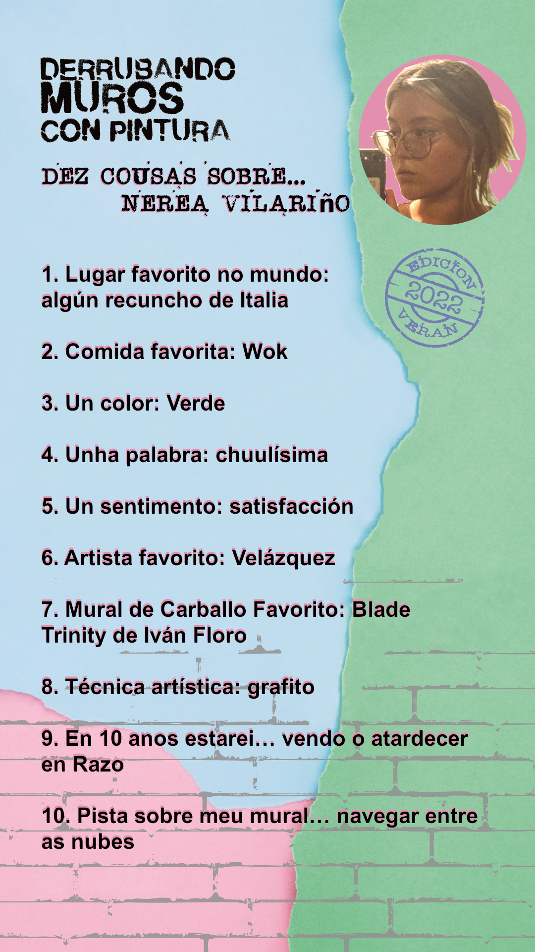 - Nerea Barrientos. Pintará na rúa Arcebispo Romero de Lema. Esta vimiancesa é Técnica Superior en dourado, prateado e policromía. A pesar de ser moi nova, realizou xa varios murais, ademais de colaborar na organización do Rexenera Fest nalgunha ocasión.