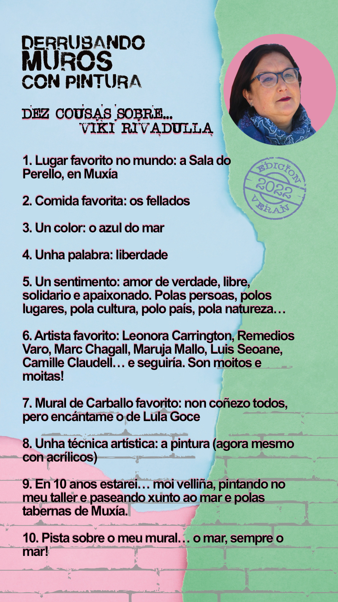 - Viki Rivadulla. Pintará na rúa Pontevedra. Naceu na Coruña pero vive en Muxía e a súa obra artística está moi ligada ao territorio no que vive, a Costa da Morte. Licenciada en Filosofía pola Universidade de Santiago de Compostela, é unha pintora e escultora autodidacta, ademais de artesá e ilustradora ocasional. O mar e a cultura mariñeira, así como as mulleres, adoitan ser as protagonistas da súa obra.