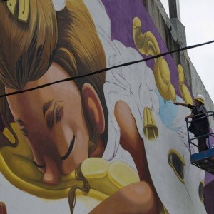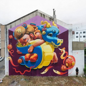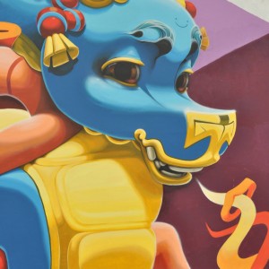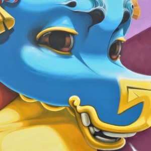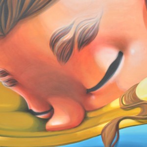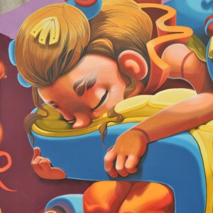 Siendo fiel a su estilo, próximo a la ilustración infantil y al mundo de la animación, nos muestra dos figuras que parecen casi mimetizarse, dos figuras de mundos muy diferentes pero que poco parece importar a la hora de compartir vivencias. La obra destaca por su color, especialmente por la gran saturación empleada, lo que hace que tenga un gran impacto visual sobre el espectador.