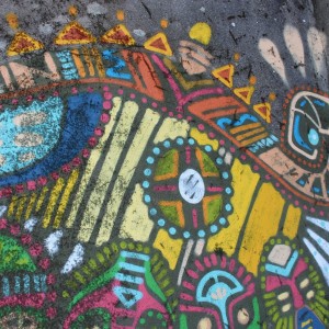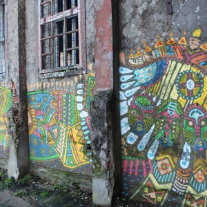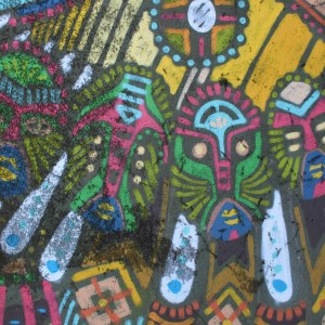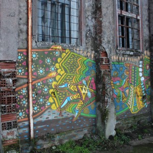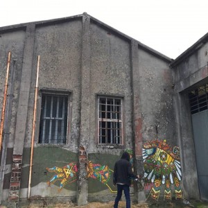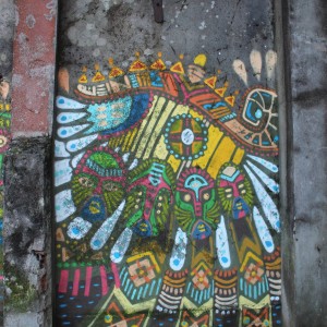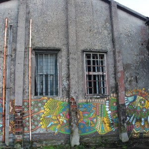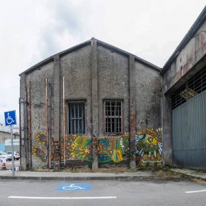 El mexicano Curiot, después de su gran mural de la calle Gardenias del lado del Pazo da Cultura, nos dejó por sorpresa esta figura con la misma estética de fondo arraigada en la cultura clásica mexicana. En este caso, en la pared trasera de la estación vieja de autobuses, está representada una figura como el chamán de su consultorio, esta vez acostada, con todos los colores, detalles y símbolos propio de los aztecas que merece explorar en detalle. El colorido y detalle de la figura contrasta con el gris del muro con el que este artista dejó una huella de México en Carballo.