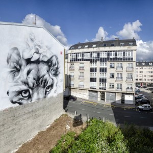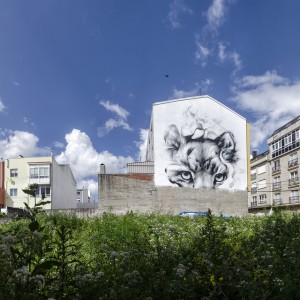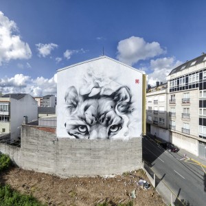Con una gama cromática muy sencilla, donde sobre un fondo blanco se representa este gran felino con trazos vigorosos en negro, crea una tensión e intensidad que destaca e hace que capte inmediatamente nuestra mirada. El mural también esconde una sorpresa. En la parte superior podemos ver cómo otros dos felinos pelean o juegan entre ellos, formando parte del conjunto.