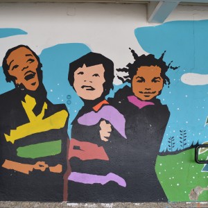 Los chicos que componen la imagen central del mural están inmersos en este momento, lo cual recordamos de forma efímera cuando somos adultos.
