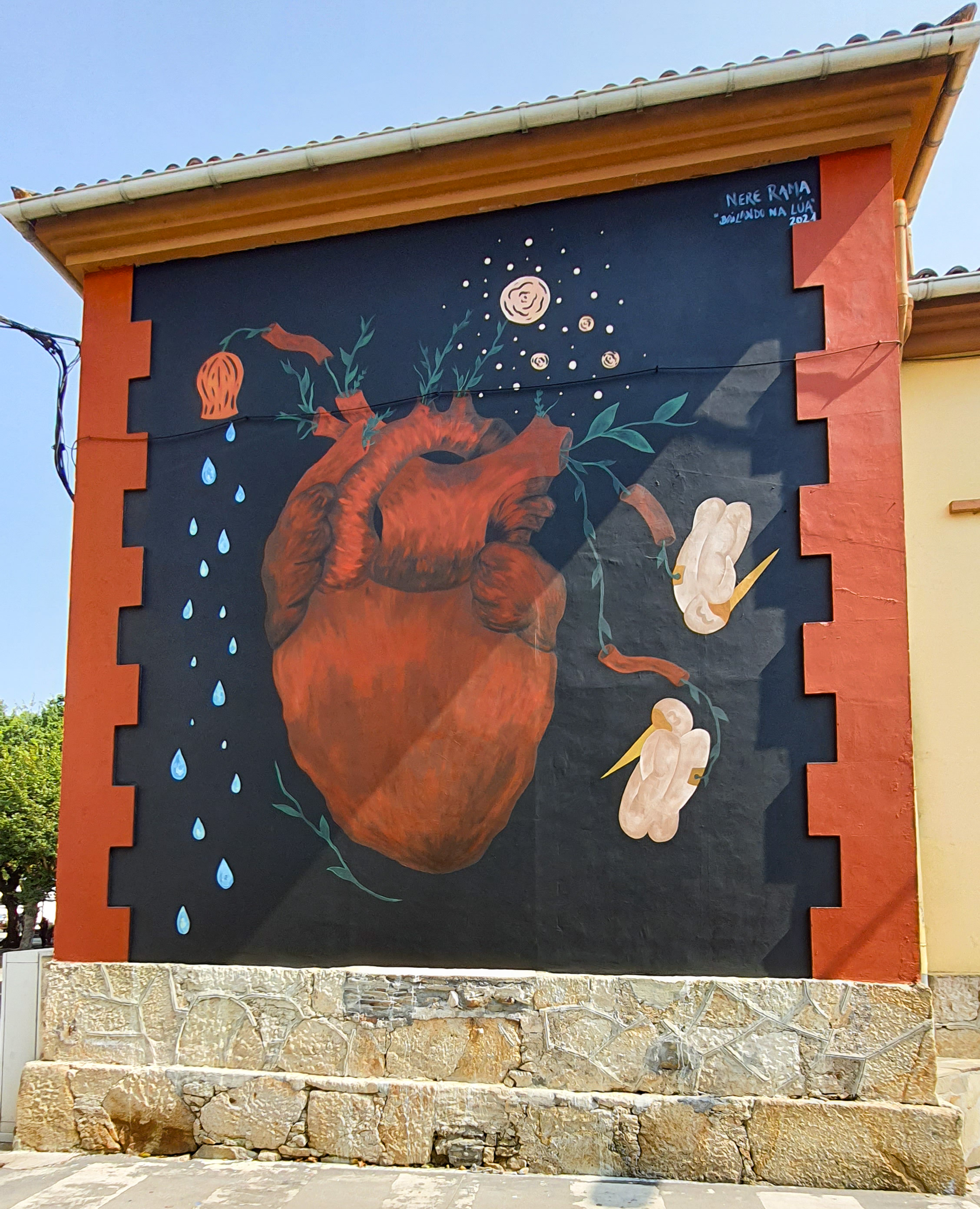 - «A liberdade interior» («La libertad interior») – Nere Rama «Bailando na lúa» (Ludoteca Municipal). El mural trata de la libertad más pura que llevamos dentro, la misma que nos hace sentir, florecer, crecer y (re)vivir. La motivación principal que tuvo la artista para llevarlo a cabo fue todo el cariño que me desprende la ubicación y que siempre lleva en la memoria. Lugar muy frecuentado en la infancia y que guardia miles de momentos buenos. La infancia es lo que te marca de alguna manera para llegar a ser lo que se quiera ser con el paso de los años, y es lo más esencial para florecer y ser libre. Amar mucho y tener la suerte de ser criada o criado aprendiendo la importancia de ser libre y así poder florecer gracias a ese mismo hecho. Eso es loprincipal que Nere Rama buscaba transmitir para ese lugar: calma, recuerdos, paso del tiempo y mucho amor.