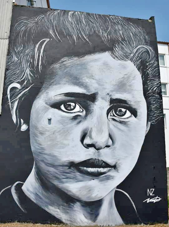 - «Crianças» («Niños») – Nazaret Franco. Calle Iglesia (zona parking del San Martiño). También llamada «Niños» tiene su inspiración en las fotografías de Sebastião Salgado un fotógrafo y fotoperiodista brasileño muy conocido por sus imágenes de personas en países menos desarrollados o en situación de pobreza, generalmente en blanco y negro. Nazaret realiza una interpretación de estas niñas y niños de la guerra retratados por Salgado. Procuró plasmar la gran contradicción que revelan las obras del fotógrafo: niños sin infancia.