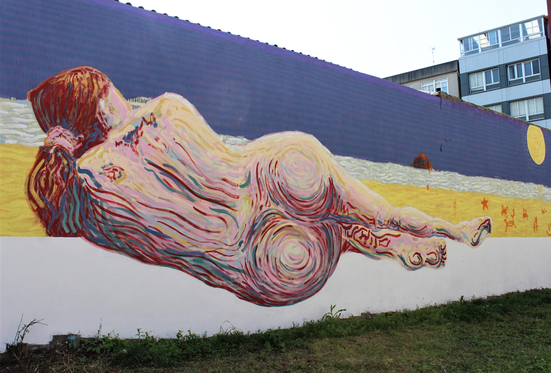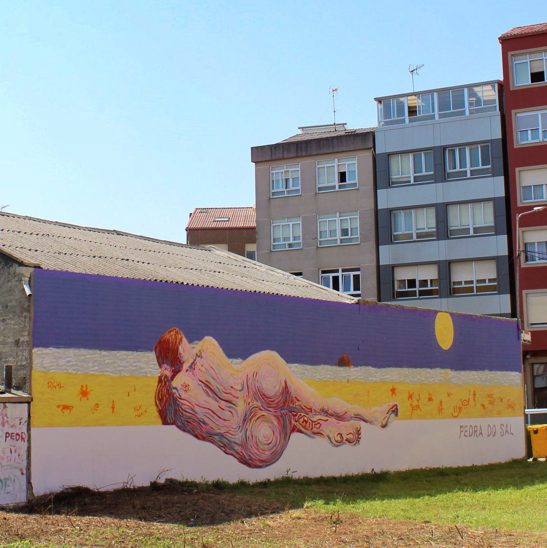 - «KLK MANIN» – Tucho (Calle Fábrica). En una ventana al Atlántico descansa una mujer en la orilla del mar. Parece levitar, tranquila, contemplando el horizonte mientras la mirada del espectador interrumpe este momento íntimo. En la arena de la playa hay un montón de pintadas que reflejan, en contraposición a la mujer, una pintura más primaria, urbana y visceral: fruto de la necesidad humana de dejar huella. En honor a la verdad, las pintadas también son fruto del árbol de la picaresca. En el horizonte están las islas Sisargas, aunque aquí tienen forma de mollete pues este mural es «más de Carballo que el pan».
