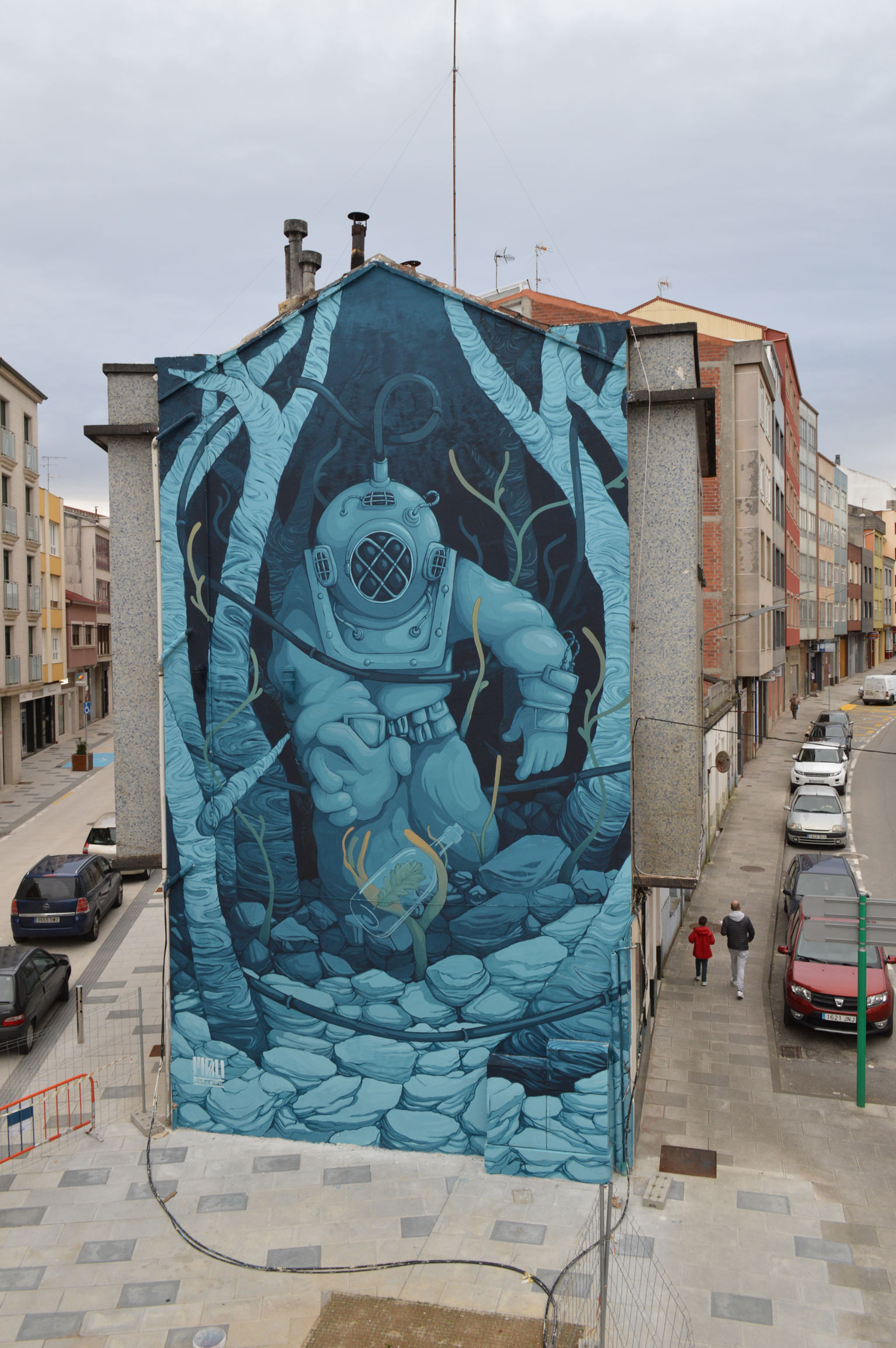 Tramo 1. Empezamos en la Oficina de Turismo, en la calle Martín Herrera. Allí siempre puedes pedir información, mapas o incluso ayuda para hacer el recorrido, así que es un buen punto de partida. Allí mismo tenemos dos murales, el Músico de Eva Facal y A Eira das Meigas («La era de las brujas») de Nana y Nada. Después de verlos, paseamos por delante de la iglesia, bajamos por la calle del mismo nombre y vemos uno de los murales más recientes, Sin titulo de Lula Goce, del Rexenera Fest 2018.
