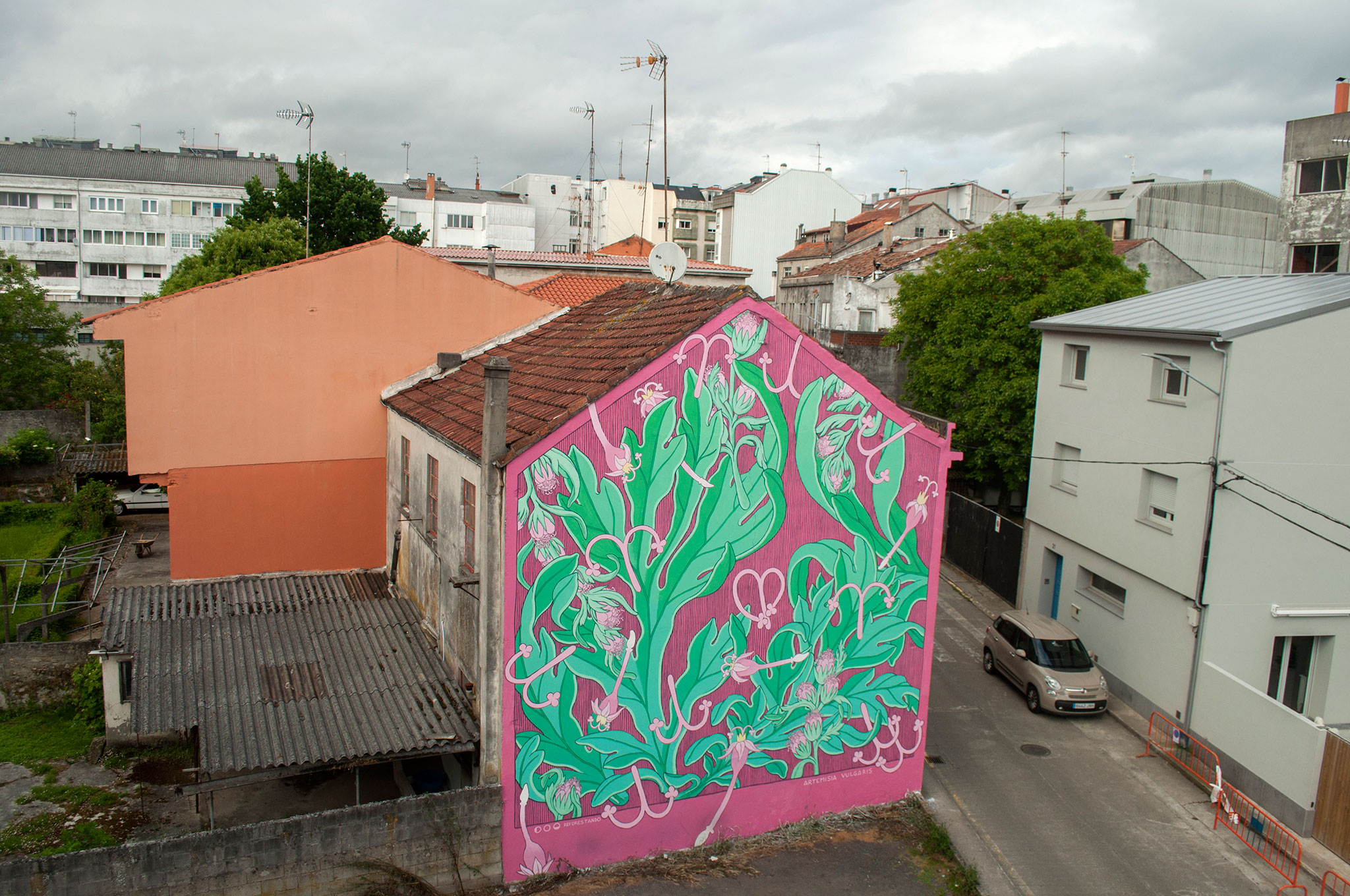 Tramo 2. Cruzamos por encima del río, seguimos su curso y nos metemos por un callejón por el San Martiño para subir unas escaleras y llegar a la calle Fomento, donde nos encontramos con A pena da moura («La piedra de la mora») de Nömada. Seguimos bajando por la calle Fomento y giramos por la calle Río para descubrir otra de las obras recientes del Rexenera Fest 2018, la Artemisia Vulgaris de Doa.